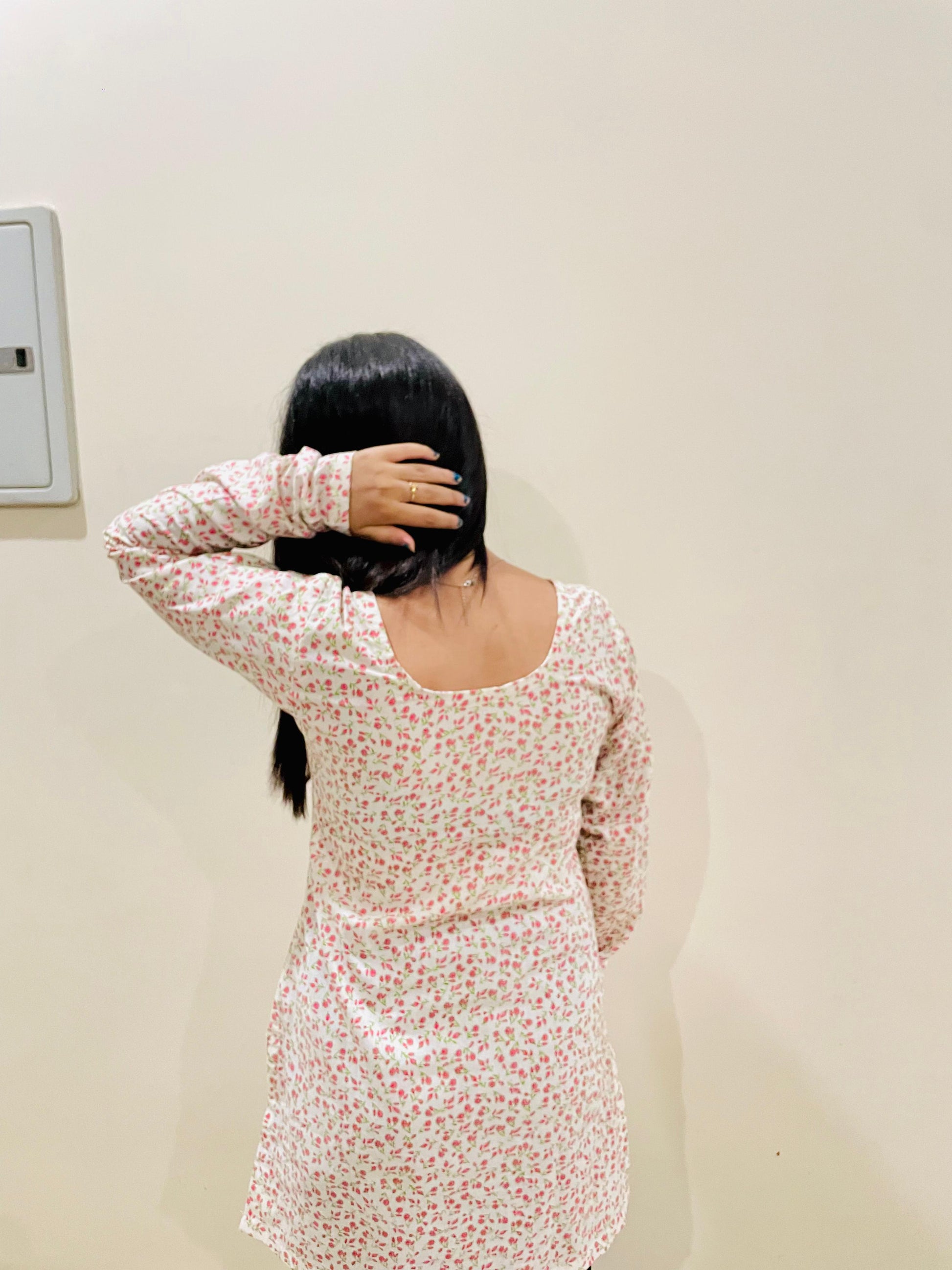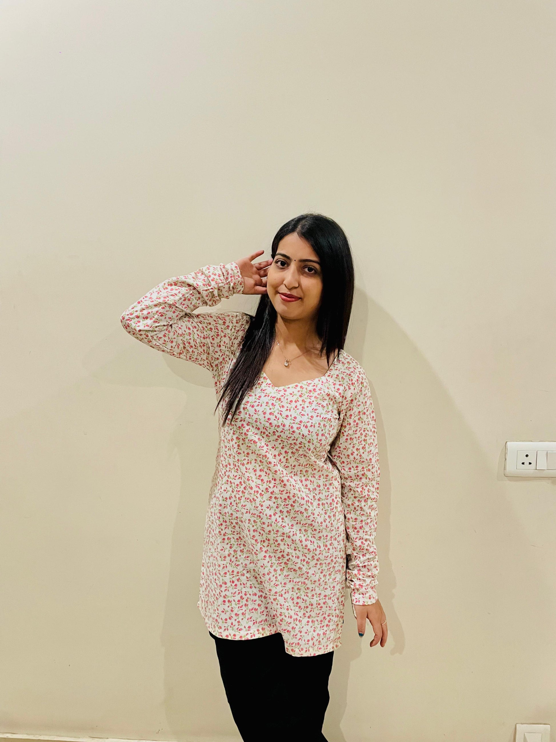Embrace effortless chic with this charming white cotton kurti, featuring a delicate all-over ditsy floral print in soft pink and green tones. Its simple, comfortable design makes it a versatile staple for everyday wear.